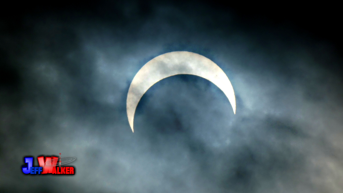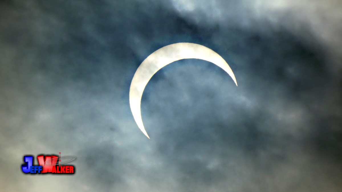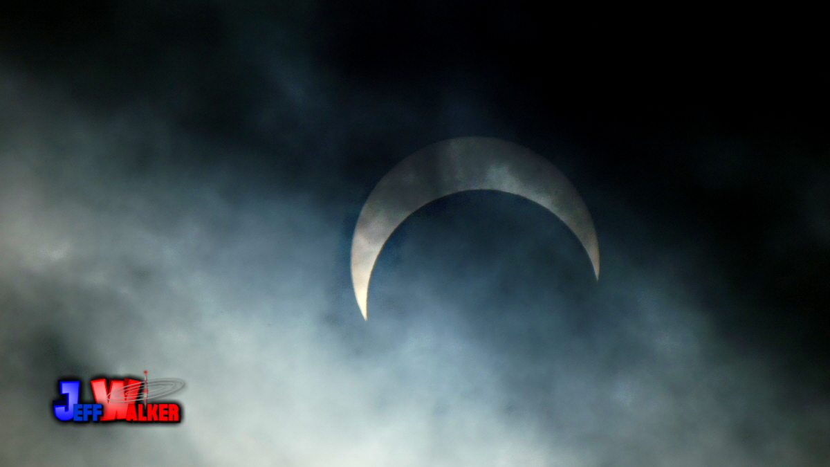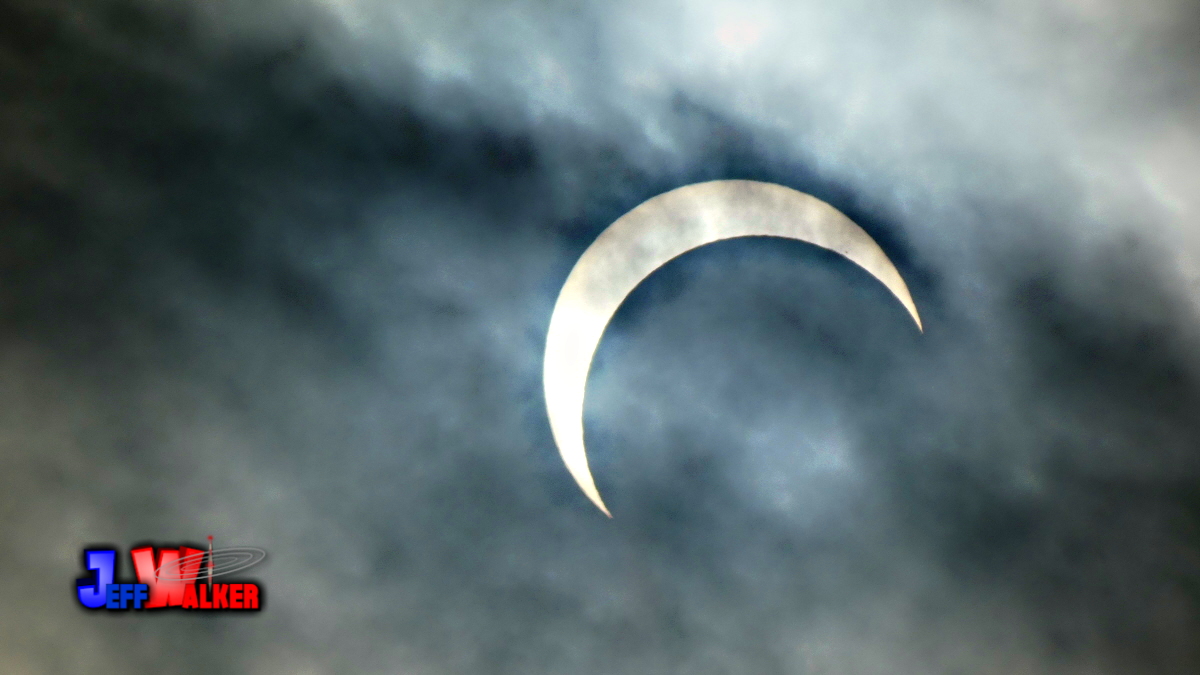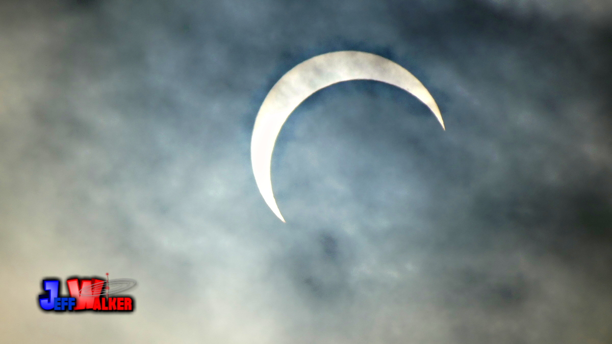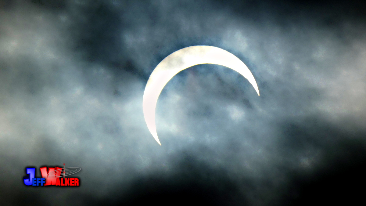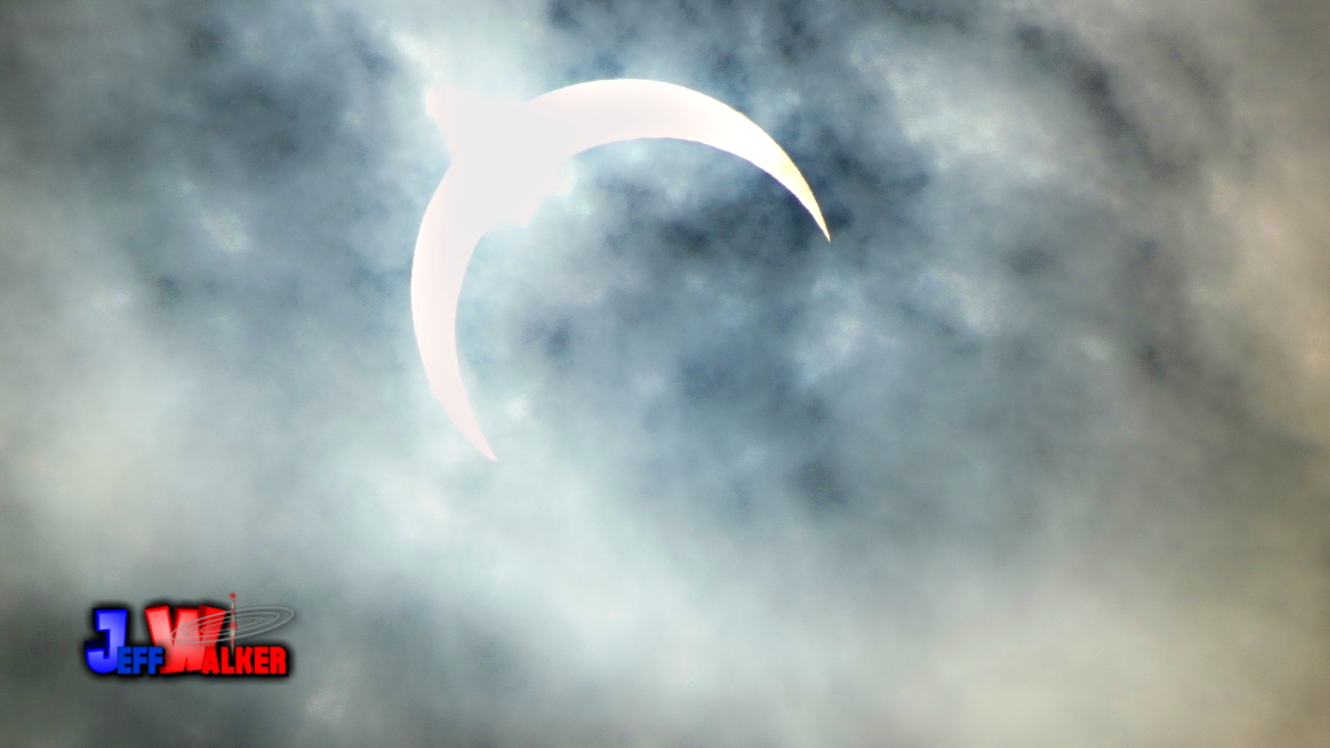 With full zoom on the camera and no tripod, I grabbed about a dozen photos in three minutes before it all disappeared behind clouds again. Seven of those photos are below in a slide show, in order. The darkest of them was the last I took before fast moving clouds covered it all up again.